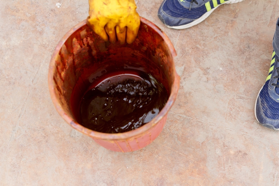 The solution for etching is prepared by mixing FeCl3 crystals and distilled water(for better reactions) or normal water in a plastic bucket. Proportion is 150g of FeCl3 crystal in 1000 mL of water. During winters hot water can also be used, so that the process becomes fast or perform the process in sunlight so that the heat helps in etching. Mixing should be done carefully, as the reaction is exothermic.