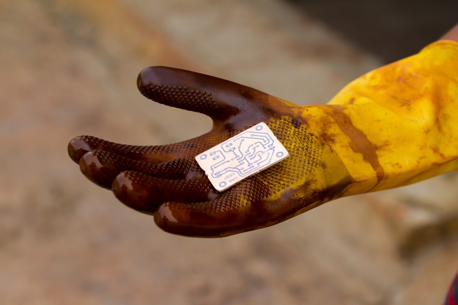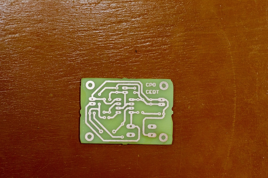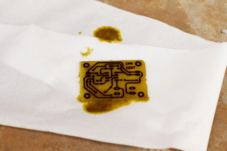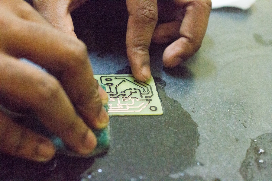 This process removes the ink from the PCB and exposes the pure copper beneath it. It is done with the help of scrub and a dishwashing liquid (eg - dettol, Vim etc).