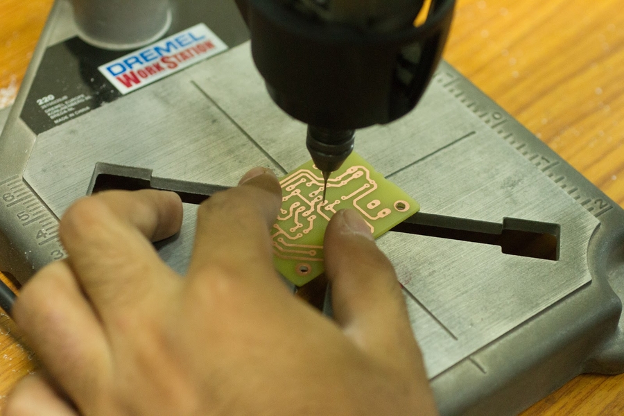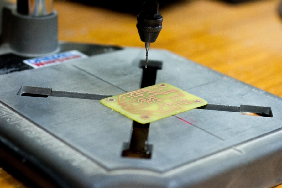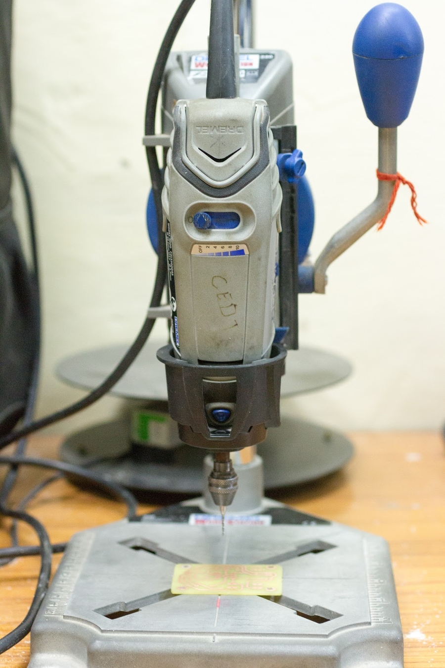 To insert through hole components we need to drill holes on our PCB. This is done using a drilling machine. Different drill bits(in general,carbide bits) are available depending on the diameter of the hole (eg - 0.7mm, 0.9 mm, 1.2 mm, 1.5 mm). Usually, the supporting screws are 3mm ones, height may depend upon user (generally it is 10mm). They are to provide ‘legs’ in other words, support to our PCB and prevent pcb to make direct connection with table.