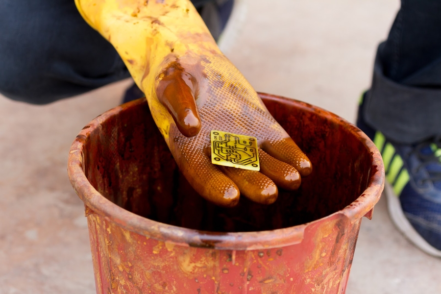 While etching, cover your nose and mouth, the fumes may affect you. Wear eye protection equipment. Be attentive while handling etching solution.